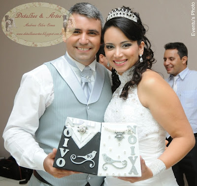 São cofres decorados de noivinho e de noivinha; o noivo ganha muito cetim, strass e até uma gravata, lembrando que a cor da caixinha pode ser da cor do terno do noivo, e a noiva é toda delicada com pérolas e strass.